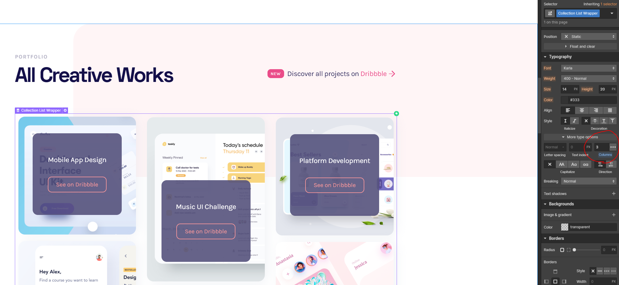 Please note, we are using a webflow trick to easily produce the 3 column masonry grid. This is controlled via the typograph column settings. Here you can change the columns, width or remove this effect and use a more standard grid.
